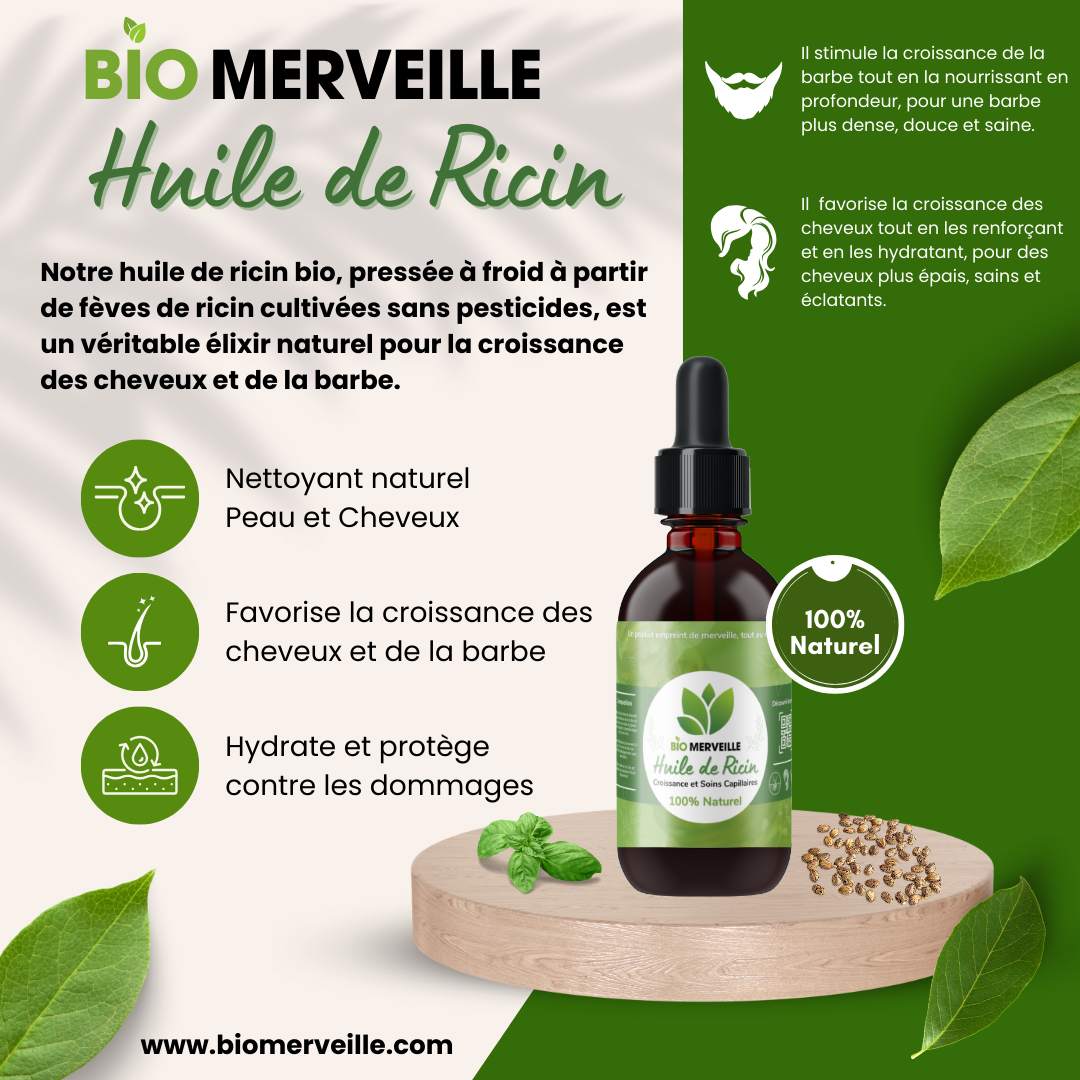 En intégrant notre huile de ricin à votre routine beauté, vous optez pour un soin éthique et durable. Elle permet d’obtenir des cheveux plus forts, une barbe plus dense, et une peau parfaitement hydratée. En choisissant notre produit, vous soutenez également une démarche respectueuse de l’environnement. BioMerveille, c’est l’assurance d’un produit sain, naturel et responsable. Chaque flacon est conçu pour sublimer votre beauté tout en prenant soin de la planète. Faites confiance à notre huile de ricin bio pour révéler votre beauté naturelle au quotidien.